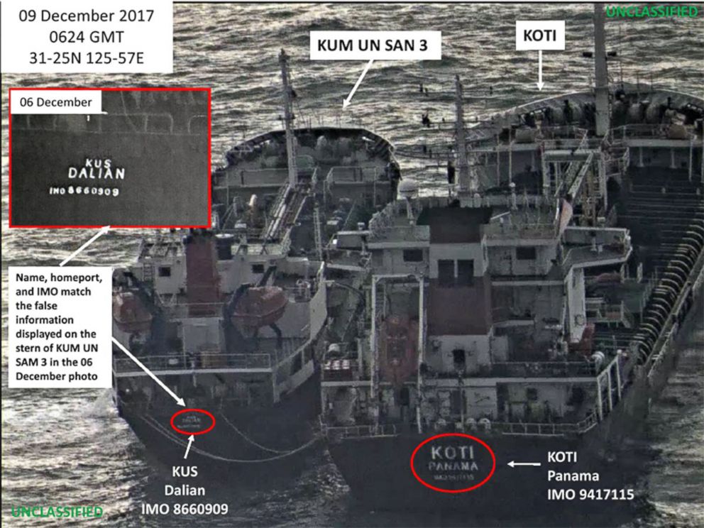 Transfers at sea may be far from the eyes of port authorities, but they do come under the watch of satellite images. The Treasury also released two images today, showing what they say are a North Korean ship falsifying its vessel information and the same ship conducting a transfer, likely of oil, with a Panama-flagged ship in December.