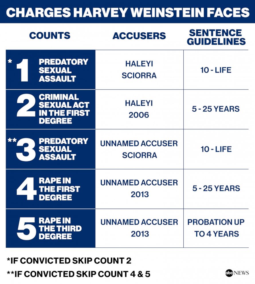 Weinstein has been charged with five counts of sexual assault related-crimes including predatory sexual assault and rape in the first degree, stemming from two women's allegations. He has pleaded not guilty to all charges and claims all sexual encounters were consensual.