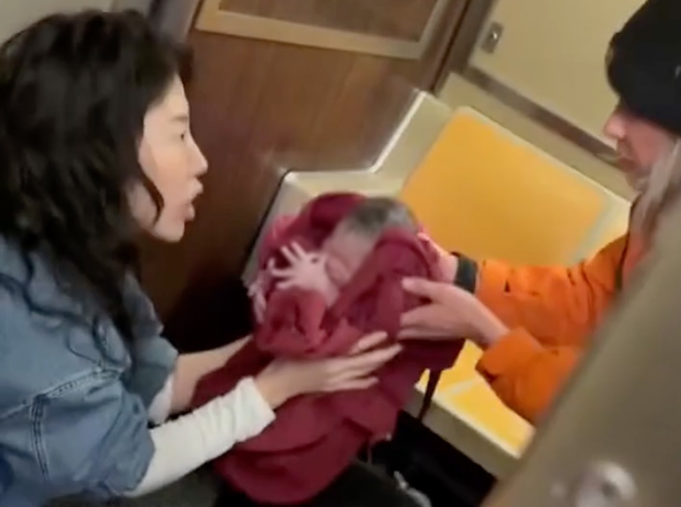 The video captured by Brown shows the woman lying on the floor after giving birth, with another passenger hoisting up the newborn and wrapping her in a red cloth.
