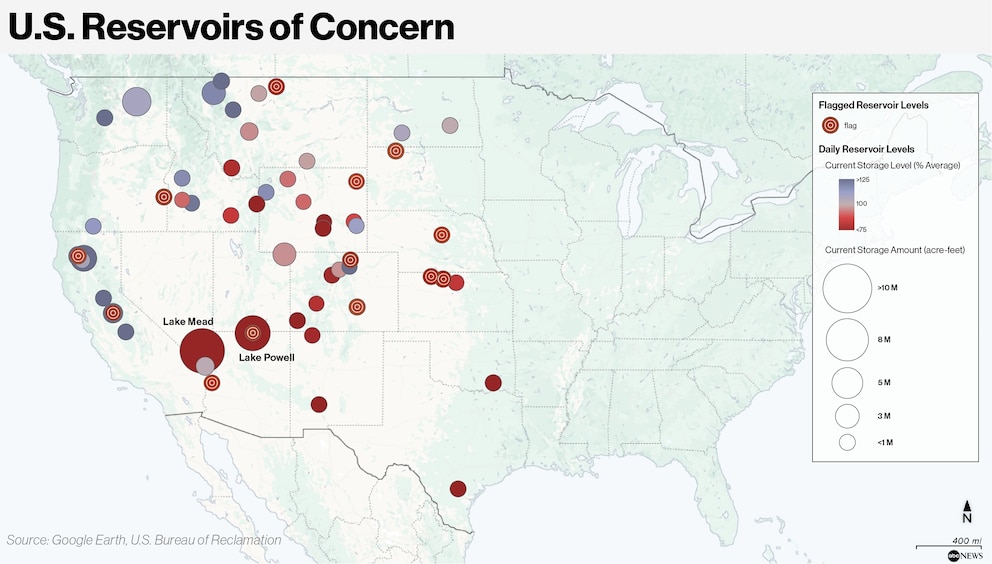 The reservoirs along the Colorado River are especially threatened, the experts said. Major reservoirs in the Colorado River Basin remain well below average, according to latest figures from the U.S. Bureau of Reclamation (USBR). As of early February, Lake Powell, in southern Utah and northern Arizona, was about 26 % full, while Lake Mead – the nation's largest reservoir by volume, located in Arizona and Nevada – was about 34% full.