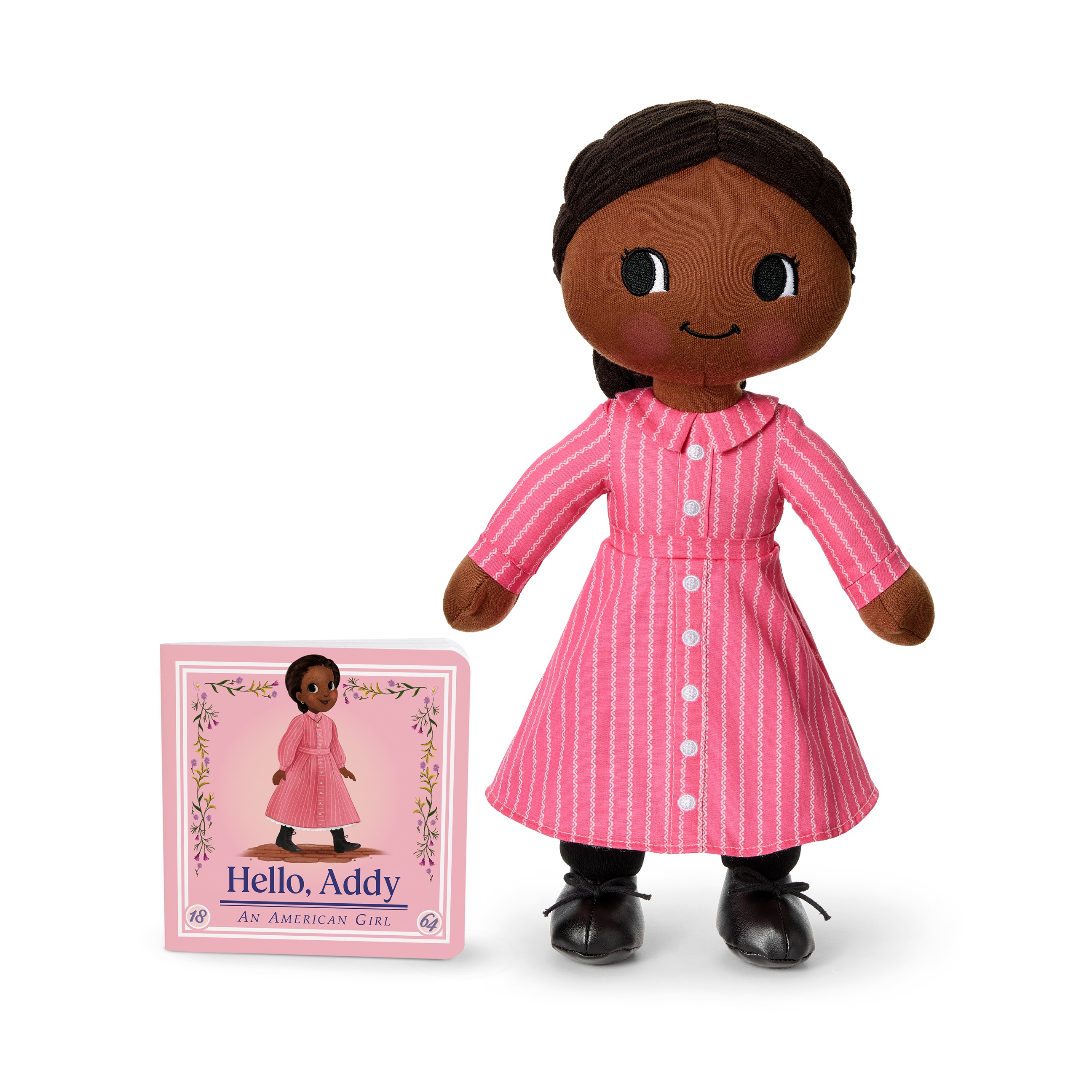 Addy is brave, smart and enthusiastic about learning, a trait confirmed by her lore as a spelling bee winner. She's growing up in Philadelphia in 1864, as reflected in her era-appropriate style: a high-neck pink dress with wavy white stripes and embroidered buttons, white drawers, black socks and black faux-leather boots.