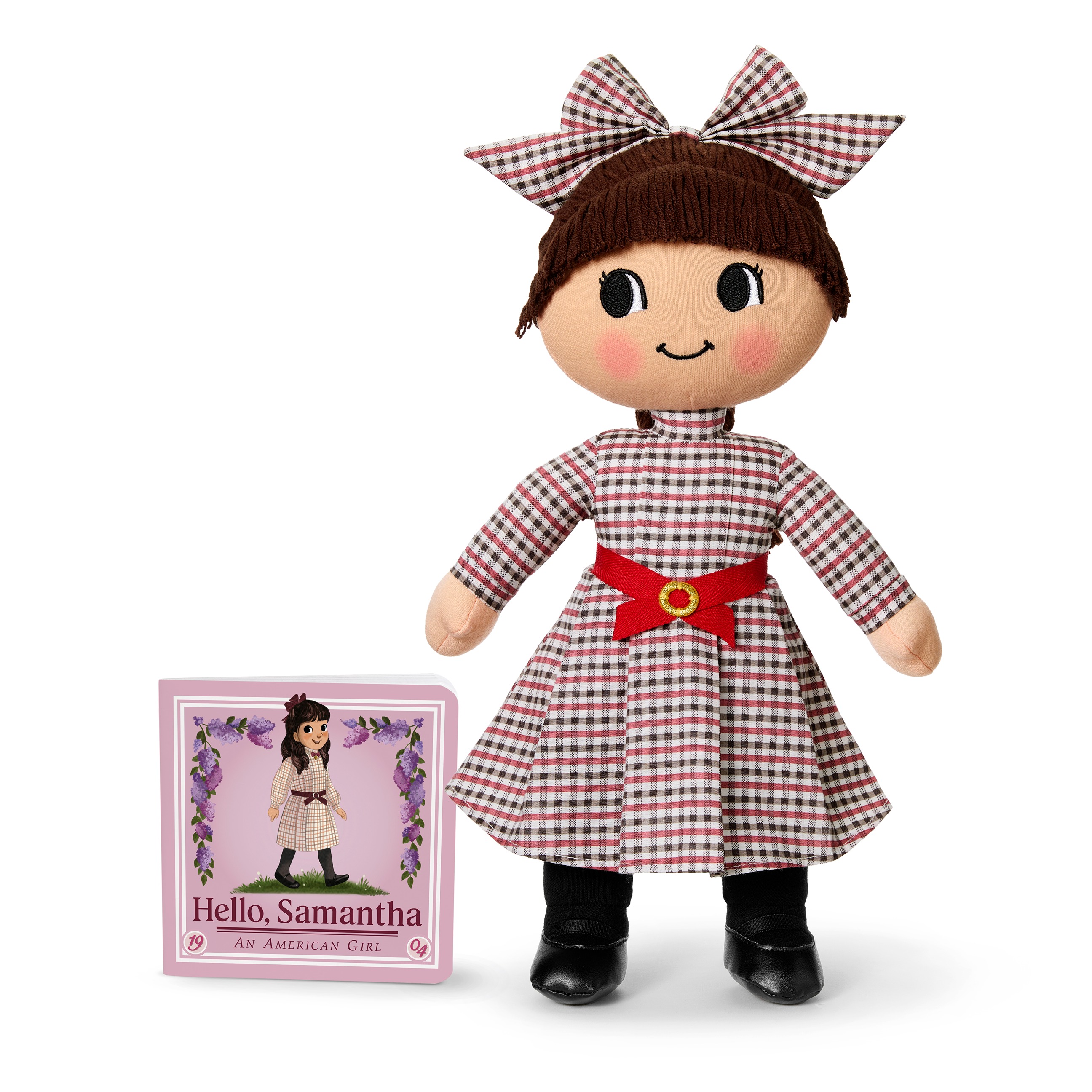 Samantha, rooted in 1904 New York, is characterized by her generosity and "spunk," according to American Girl. She's highly fashionable, with her brown yarn hair styled with a large gingham bow and ponytail braid to complement her multicolored check dress.