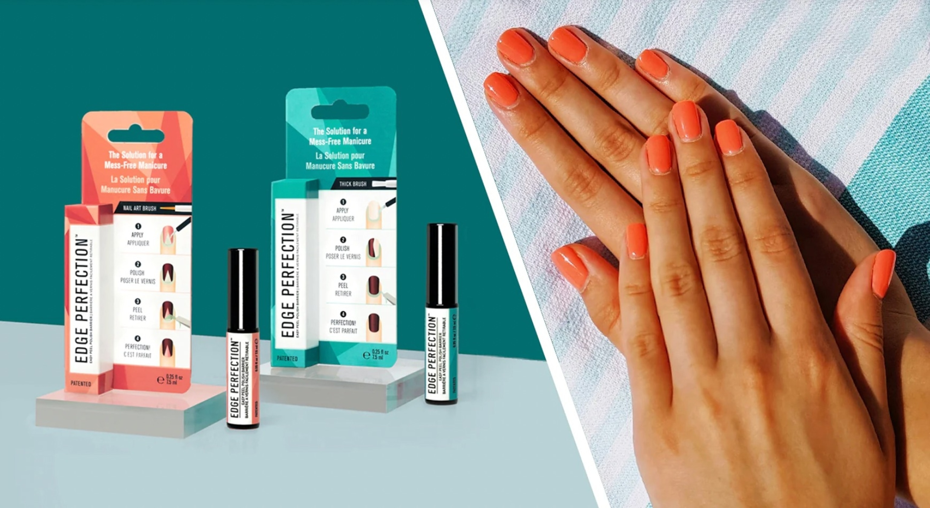 Reveal a clean, precise manicure. Most at-home manicures end with a Q-tip and a lot of frustration. Edge Perfection makes the mess disappear -- literally. Brush the liquid barrier on the skin around your nails before polishing, then peel it away after for salon quality precision. The thin brushes can also be used for French tips, fine details, and intricate styles.