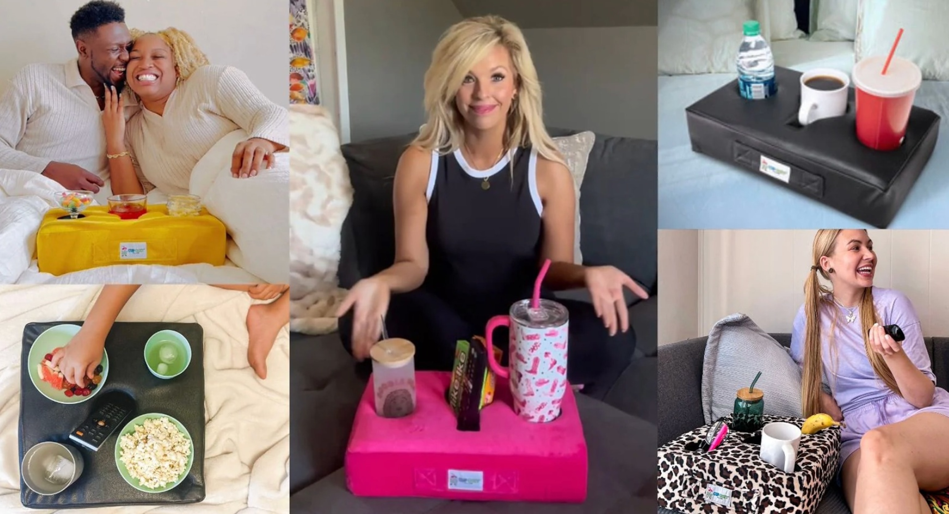 Stop your spills. The Cup Cozy Pillow is a pillow soft drink holder so you can keep your drinks close, wherever you are. The secret is the adaptable foam inside that expands to fit almost any size or style of cup/mug. Designed to be used by anybody and exactly where you want it -- couch, floor, bed, car, and more. The soft yet durable, removable, washable covers make cleaning quick and easy. Options available with two, three and five cup holes.
