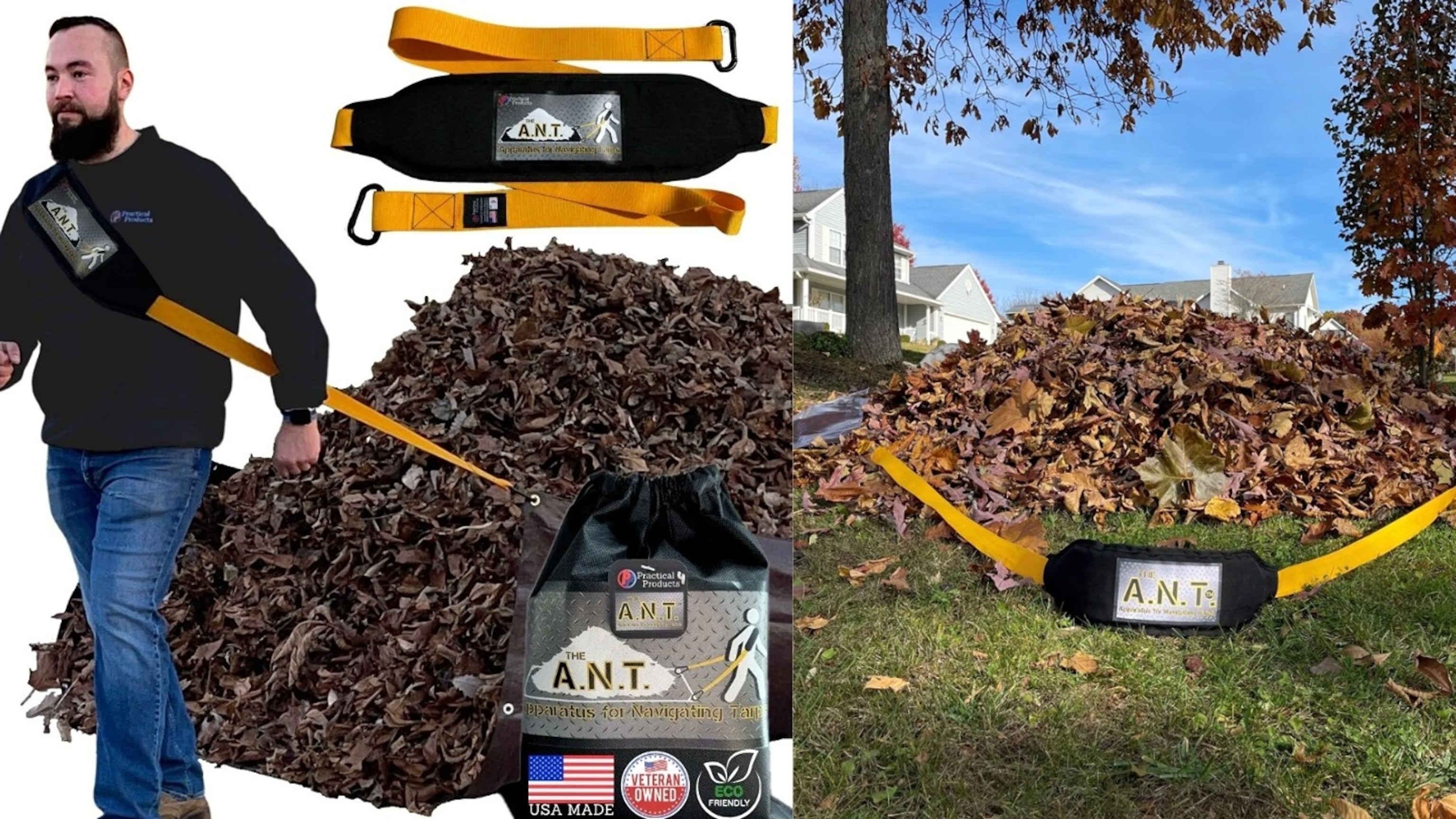 Take the hard work out of yard work with The A.N.T., a heavy duty padded strap that clips into the grommets of a tarp, making your fall cleanup faster, safer, and easier. The A.N.T. strap saves time and reduces fatigue moving yard materials -- works great for leaves, sticks, walnuts and more. The small tool gives ant-like strength, easy to use with no fuss. The 10-foot-long strap and carabiners are compatible with virtually all tarps. This heavy duty helper was designed by father and son landscapers and is made in the U.S.