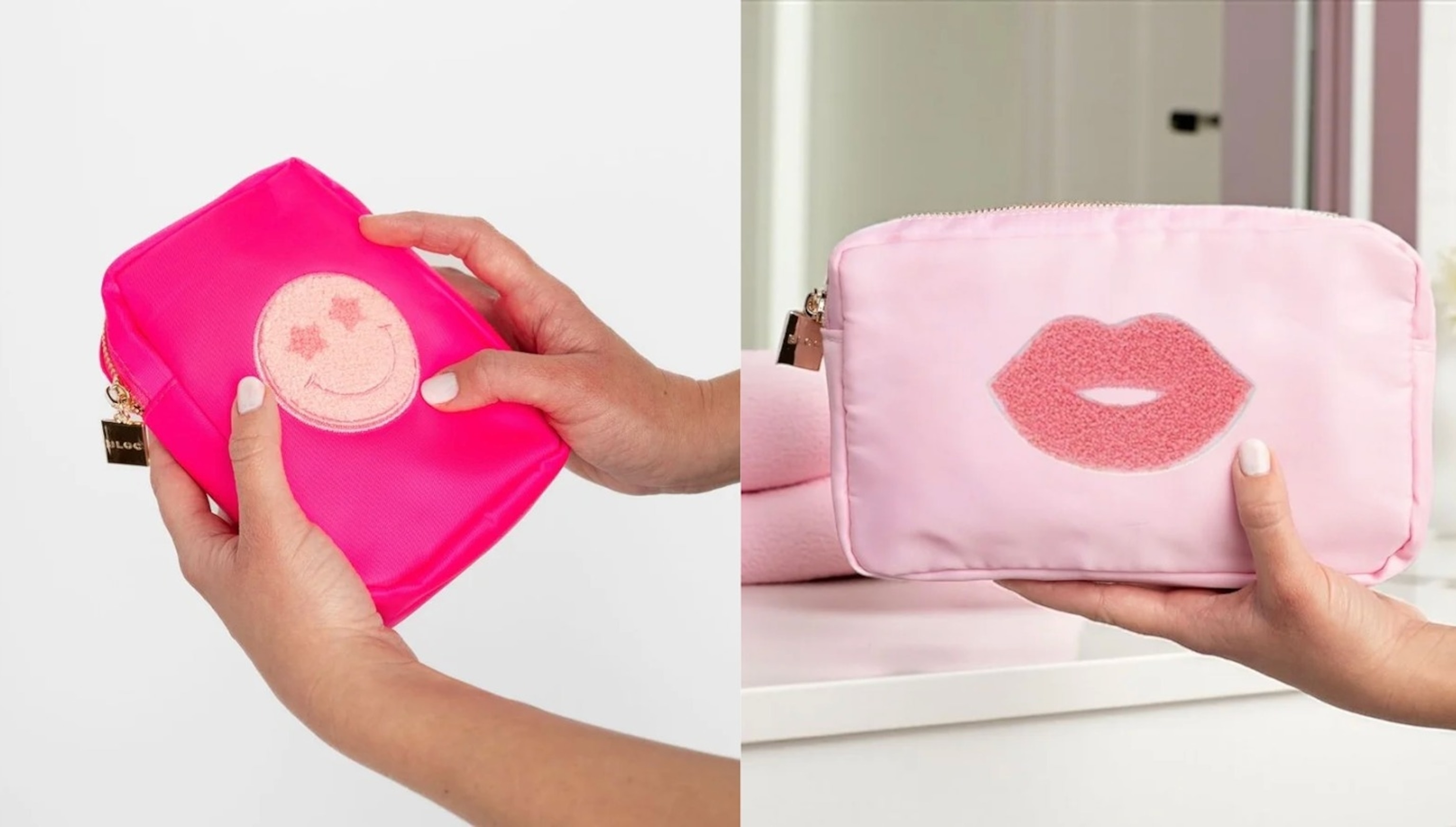 Keep makeup and skin care secure and organized wherever you go. Cute and fun chenille appliqués and gleaming hardware refine these nylon canvas cosmetic bags for a touch of fun in your weekender. Choose from three sizes.
