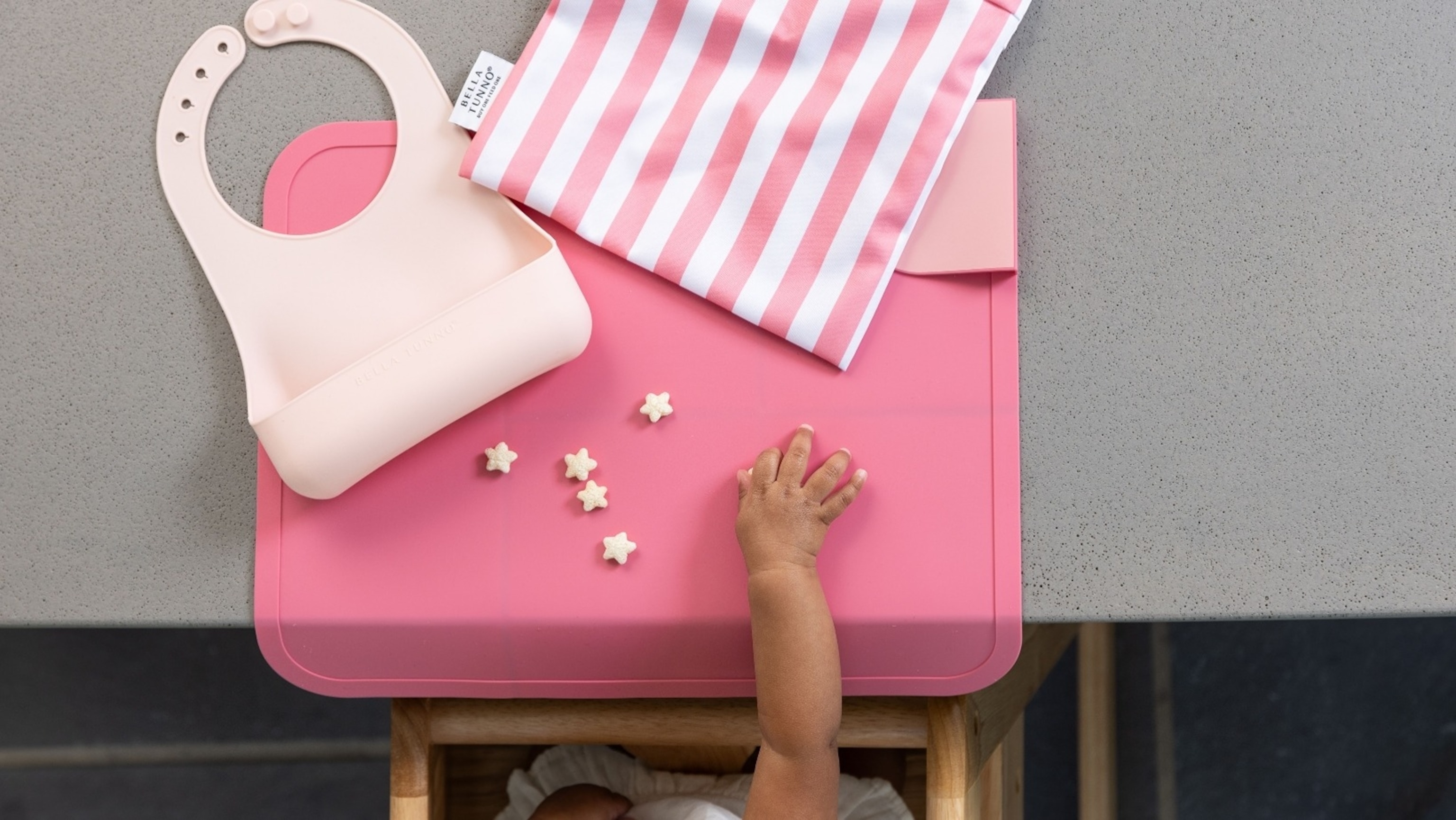 Buy one, feed one with Bella Tunno, the purpose-driven baby brand on a mission to end childhood hunger. For every product purchased, Bella Tunno donates one meal to one child through Feeding America, donating 15 million meals to date. The Wonder Bib features a generous catch pocket so all the food that misses the mouth is ready for round two. The neck closure adjusts to four sizes, extending the life of the bib as kids grow. The suction plate is divided into three sections for well-balanced meals, designed to reduce frustration and mess when little ones learn to self-feed. The placemats fold for travel but also flap down over the table to add an extra layer of protection. All food accessories are made with 100% food grade silicone free of BPA, PVC and phthalates. The Zip Fit & Beanie Set features a magic comfort and stretch one-piece that will grow with baby two to three times longer than the average one-piece, and a matching beanie. Singles and sets are available. Shipping is $5.99 or free over $50.