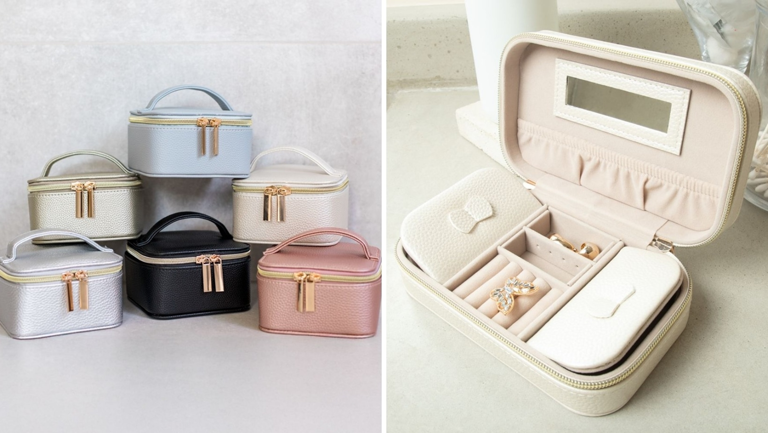 Organize and transport your jewelry. Brouk & Co's pieces are designed with the modern individual in mind. From soft cases to hard boxes, keep your jewelry safe and easy to find when you're ready to switch up your look. Crafted with vegan leather, smart features like mirrors, ring rolls, necklace hooks, separated compartments and more. Add optional personalization to your case with one to three initials. Shipping is $3.95.