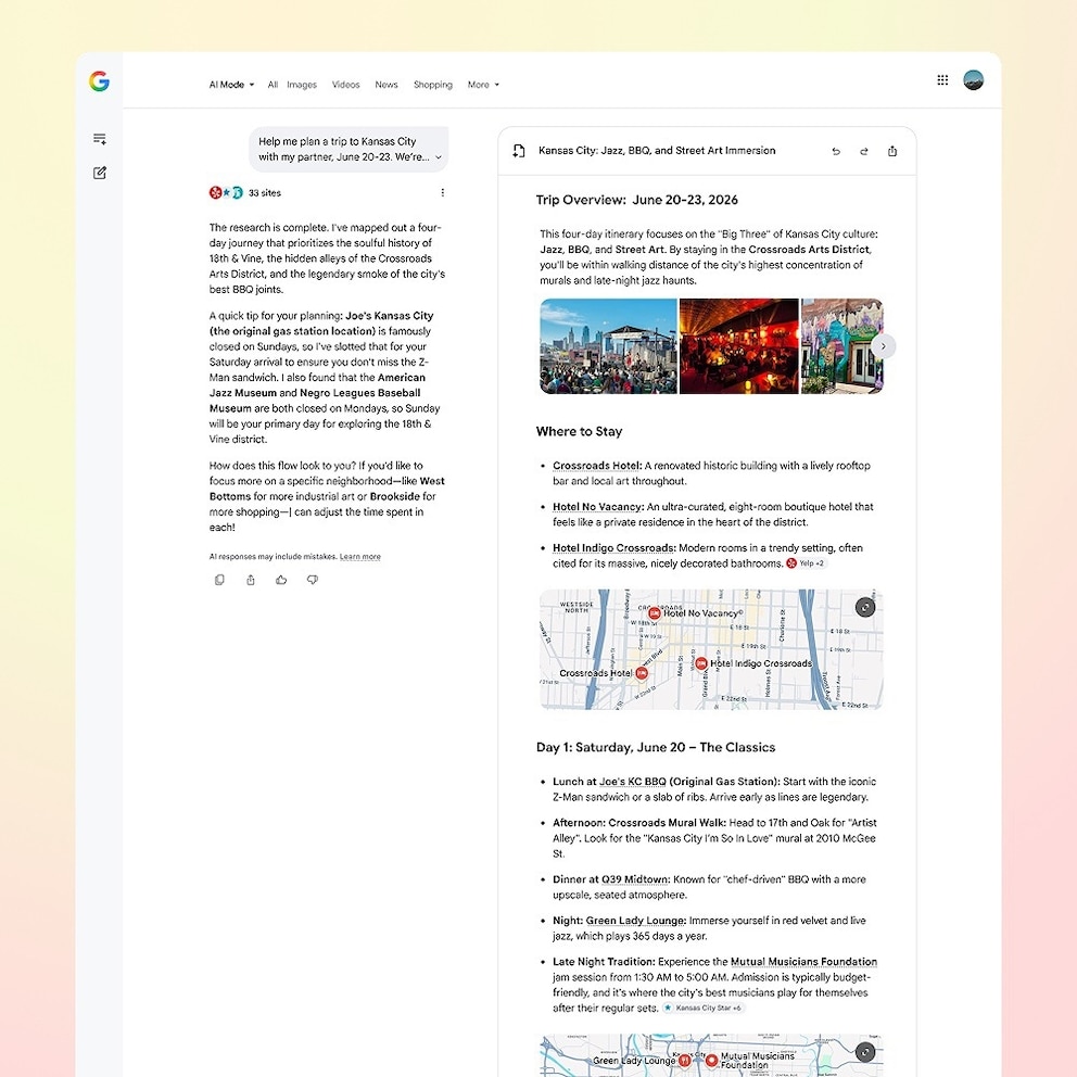 Other Google functions like AI Mode in search offer a way to get granular with specific needs and preferences and allow for customization and multiple iterations of planning an itinerary, from brainstorming to booking.