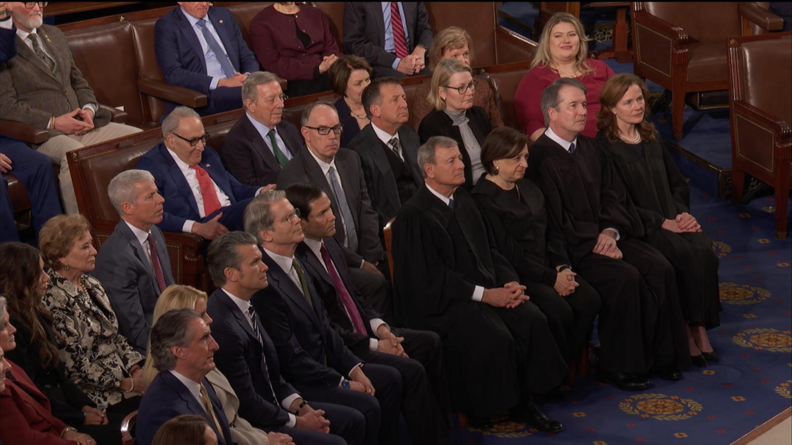 With four Supreme Court justices seated in the front row, President Trump criticized the Supreme Court's recent ruling striking down most of his global tariffs as illegal.