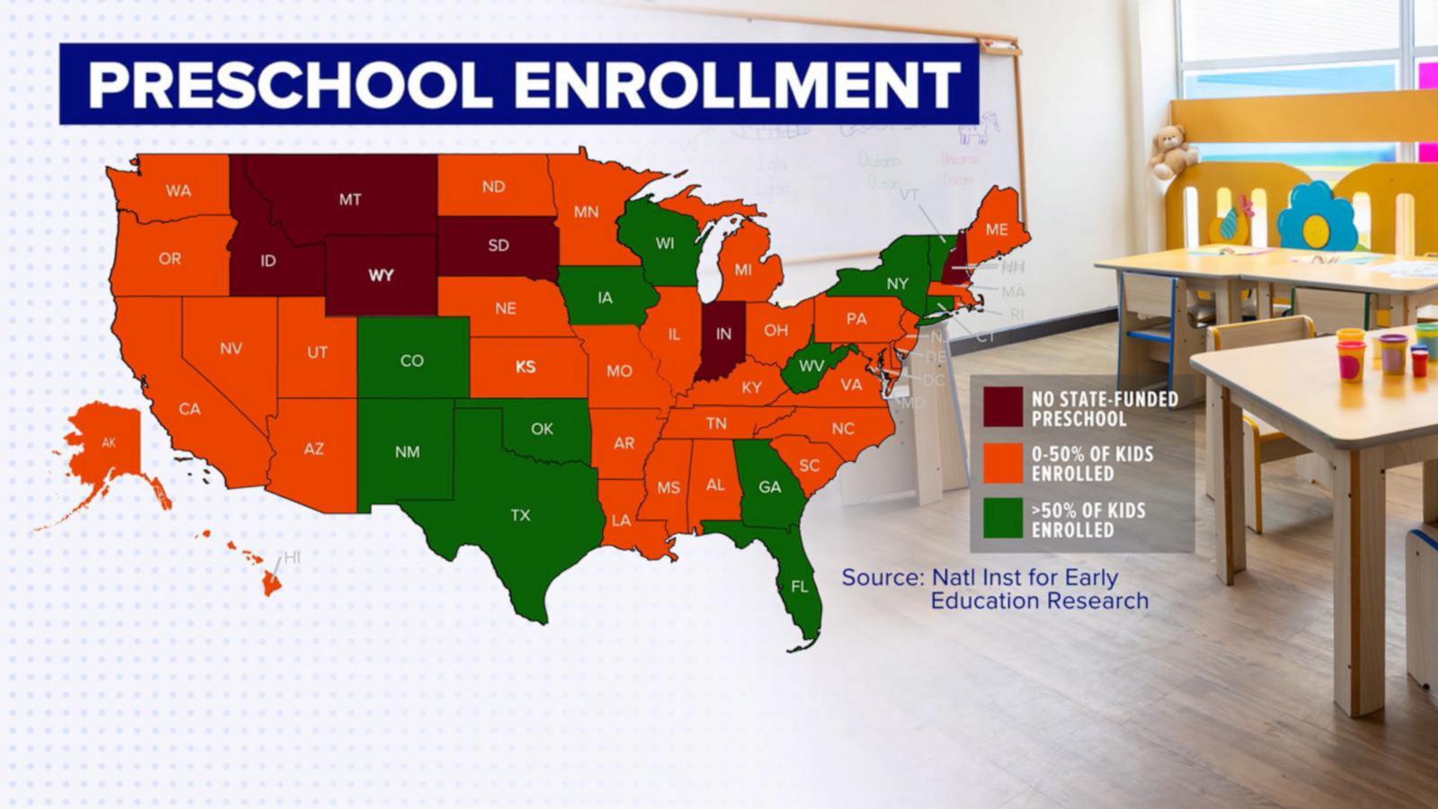 A new report shows six states do not offer any state-funded preschool programs, while 12 states have more than half of 4-year-olds enrolled.