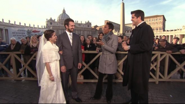 Robin and Josh talk to newlyweds who came to the Vatican in their wedding garb to meet the pope.