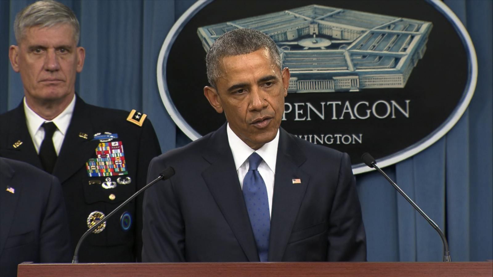 sident Obama, in a rare visit to the Pentagon, delivering remarks on his strategy to defeat ISIS after receiving a briefing from his military brass.