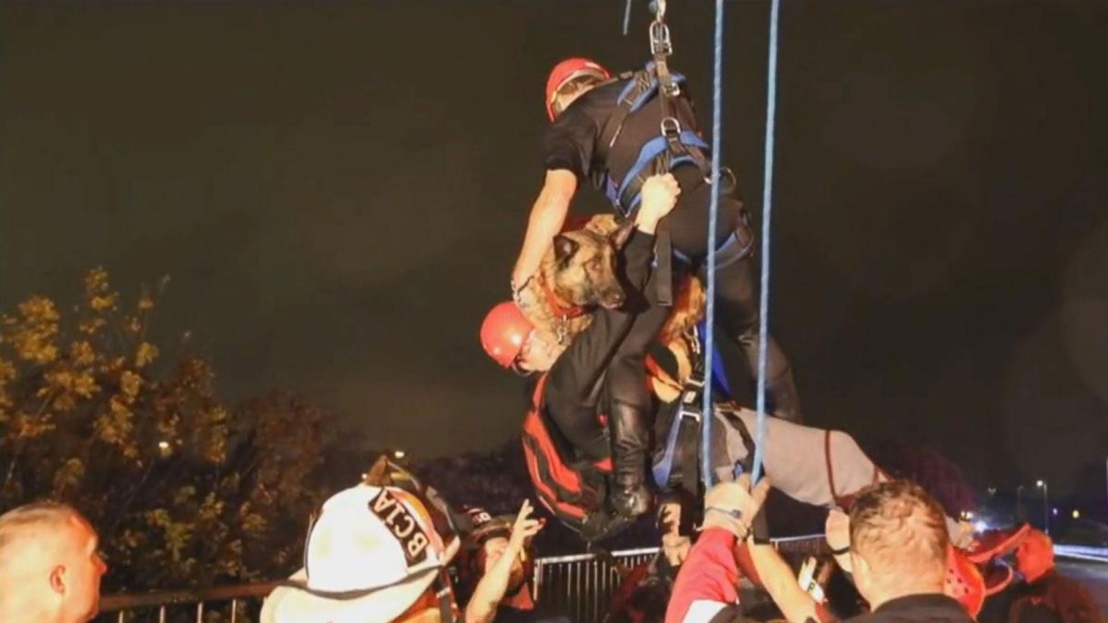 Rescuers helped hoist a man and a dog to safety when they were caught in floodwaters in McKinney, Texas on November 27, 2015.