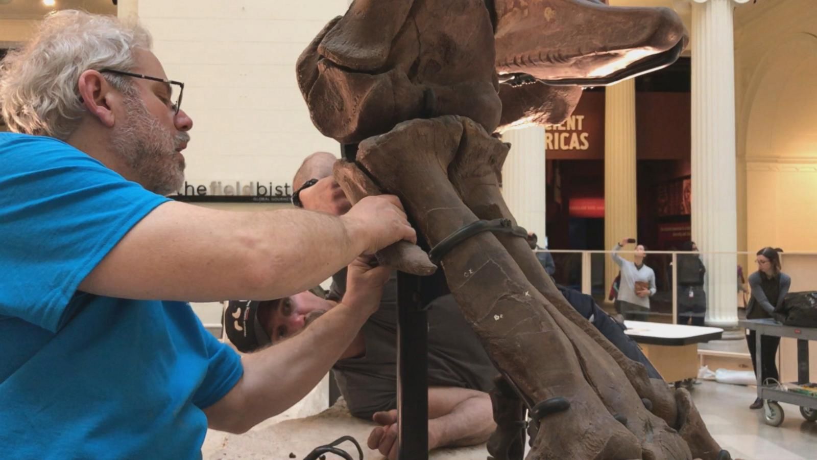 Staff at The Field Museum in Chicago remove the feet from Sue, the most complete T. rex skeleton that's ever been discovered, Monday as they start the process of moving the specimen to its new exhibit.