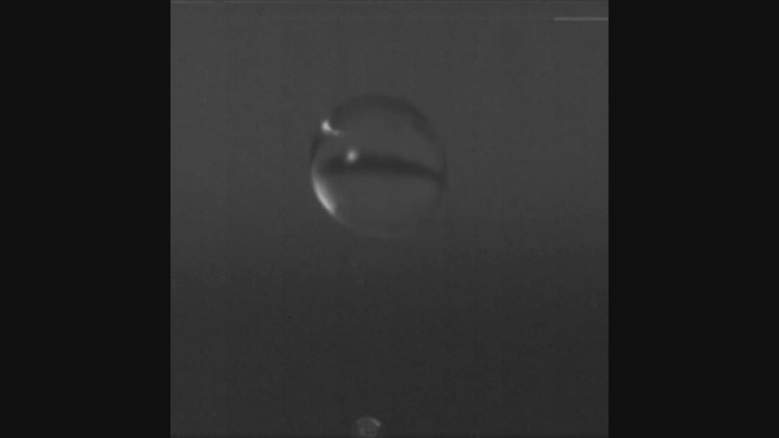 The sound comes from the movement of a trapped air bubble beneath the water's surface after the drop lands.