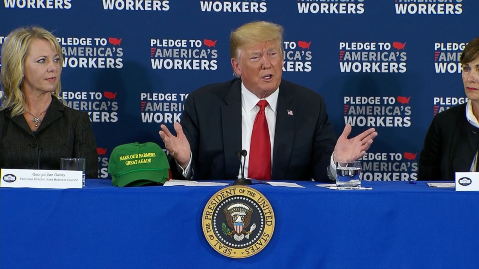 The president also doubled down on his trade war with China during a visit to Iowa.