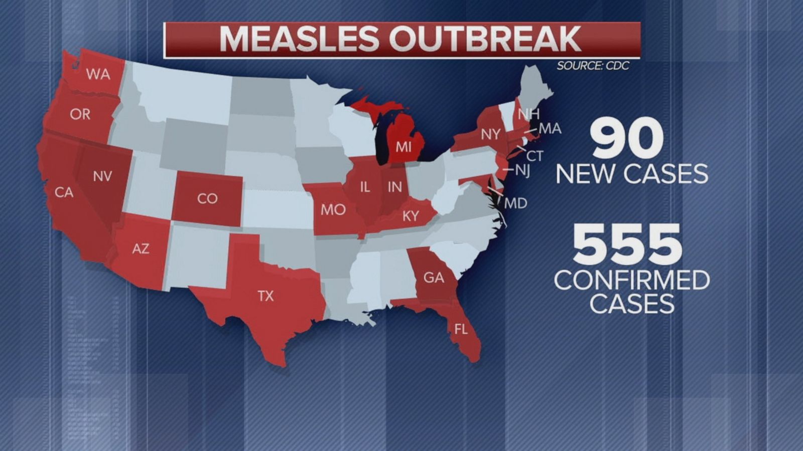 There are now 555 confirmed cases in 20 states; measles is at its second-highest level since being declared eradicated nearly 20 years ago.
