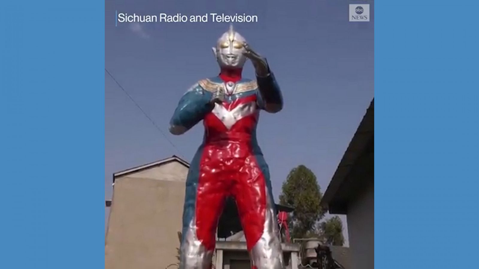 A father in China built a roughly 15-foot tall sculpture of Ultraman using over 1,000 abandoned tires for his son’s birthday.