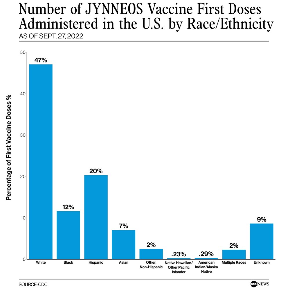 Additionally, 47% of first doses of the JYNNEOS vaccine -- a two-dose vaccine approved by the U.S. Food and Drug Administration to prevent smallpox and monkeypox -- have been given to white Americans, despite accounting for less than 30% of weekly cases with reported demographics, according to the CDC. Meanwhile, Hispanic Americans have received just 20%.